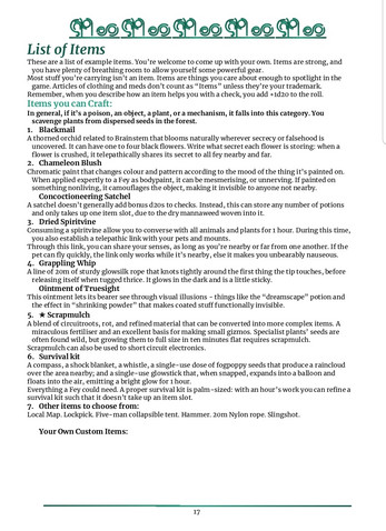 I recommend printing one-sided, then dyeing the printed pages in boiled red cabbage water (40 mins boil, ~10 min dye, don't let them stick), then dripping orange juice over it. Pages 3, 4, 5, and 7 together function as the game's "quick reference"